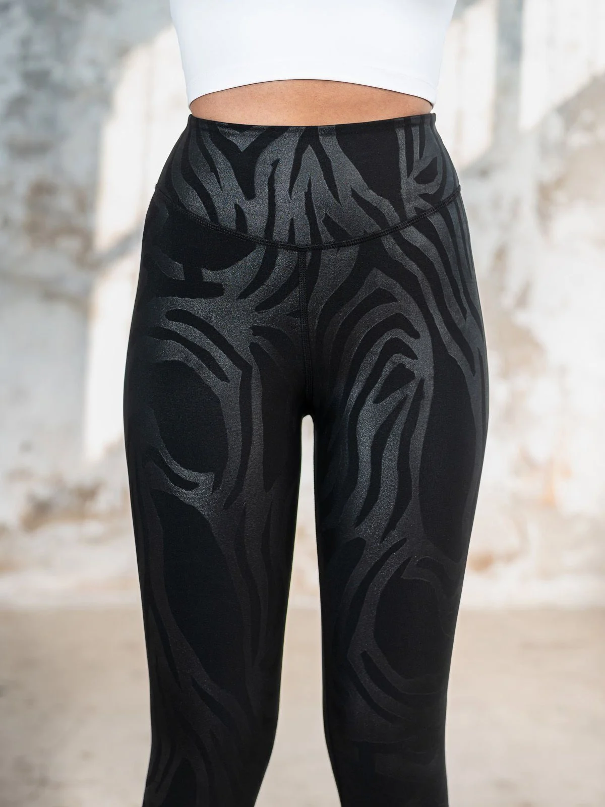 Mat crna podloga kombinovana sa sjajnim šarama u obliku zebrinog uzorka daje raskošan i luksuzan izgled koji ih izdvaja od klasičnih modela, čineći ove helanke atraktivnim izborom za svaku priliku.