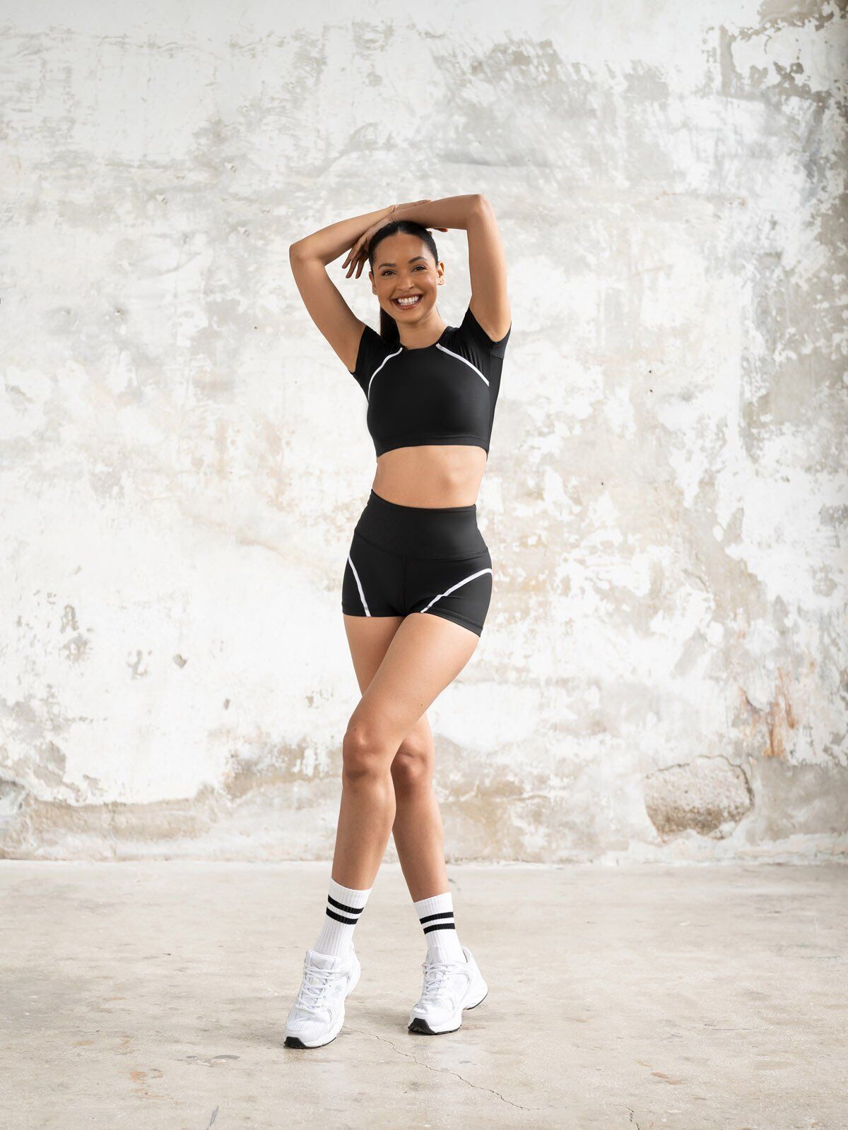 Top od gustog i elastičnog materijala pruža sigurnost i oblikuje figuru, dok kratki rukavi i elastični šavovi omogućavaju stabilnost i udobnost pri svakom pokretu. Mini šorc je izrađen od potpuno neprovidne tkanine koja oblikuje siluetu, sa visokim strukom koji ostaje na mestu i tokom najintenzivnijih aktivnosti.