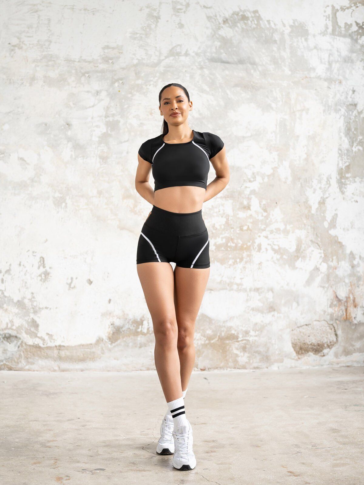 Shape Line komplet kombinuje sportski top sa kratkim rukavima i mini šorc u crnoj boji sa belim detaljima, nudeći savršen balans udobnosti, funkcionalnosti i stila. Idealan je za žene koje žele praktičan, ali i atraktivan outfit za trening i svakodnevne aktivnosti.